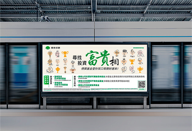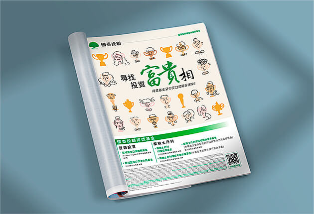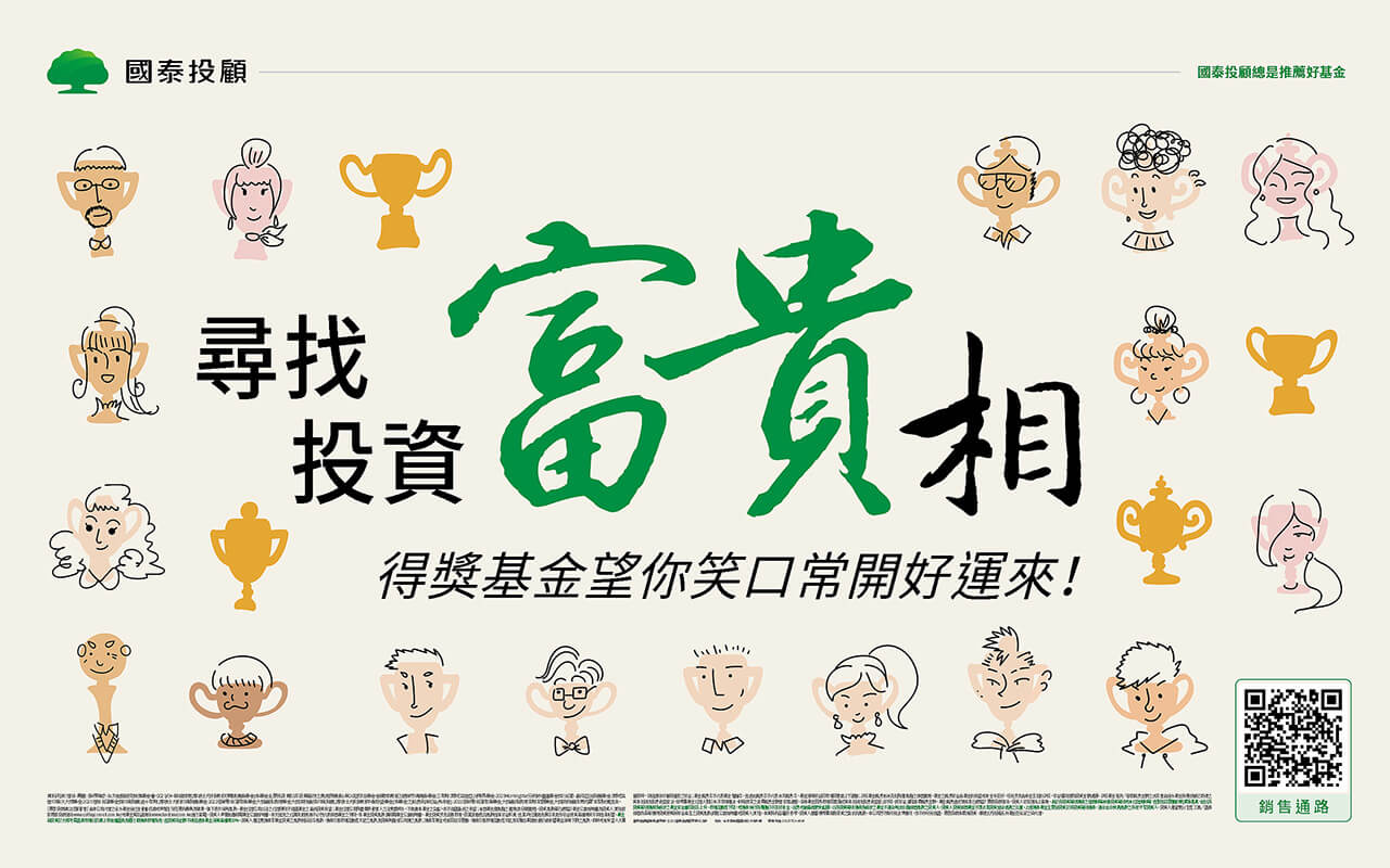 天生富貴的人少、後天富貴比較實在,因為買到國泰投顧的得獎基金,所以心情愉悅、笑口常開,看著看著也有了富貴相。以插畫為表現方式、將各式各樣的獎盃作為人物的臉部、搭配隨意、輕鬆的筆觸呈現視覺。