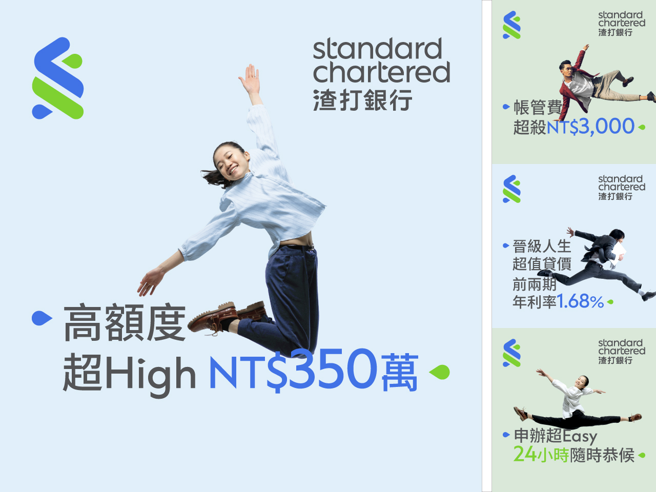 渣打信貸系列,呼應各個季節的資金需求,在季度視覺上以清新、符合渣打風格的影像呈現,在網路廣告投放上,則以各種不同的切入點,更多的趣味性,以文字、插圖表現,接觸不同的借貸族群。