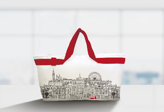 不只是贈品,也想成為樂於攜帶的環保袋。僅使用企業色系的紅、灰惟二色調,並以精細線畫描繪出:保誠人壽的建築與倫敦的市容;細膩的質地與作工,也滿足了時尚的要求。