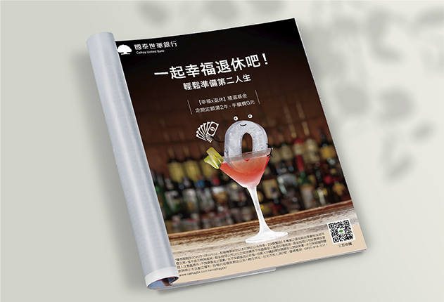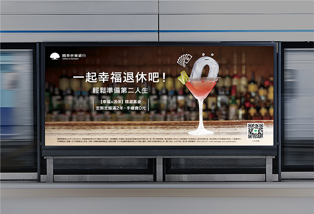 一杯清爽的雞尾酒暗示著退休人生的期望,酒杯中數字零的造型直接點出商品的最大亮點,生動的表情添加視覺的豐富性。