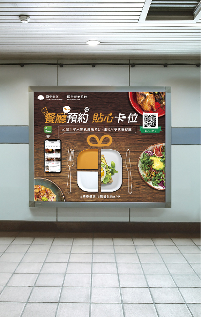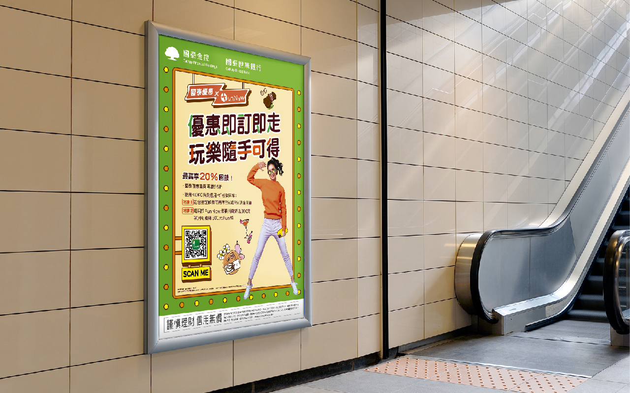 整合國泰集團的食衣住行於此APP,根據不同合作對象以及優惠於每季推出燈箱廣告。透過活潑的人物以及鮮豔的顏色呼應此APP生活、有趣的服務,除此之外主副標也採用額外設計的字體,讓活動的主題更加突顯。