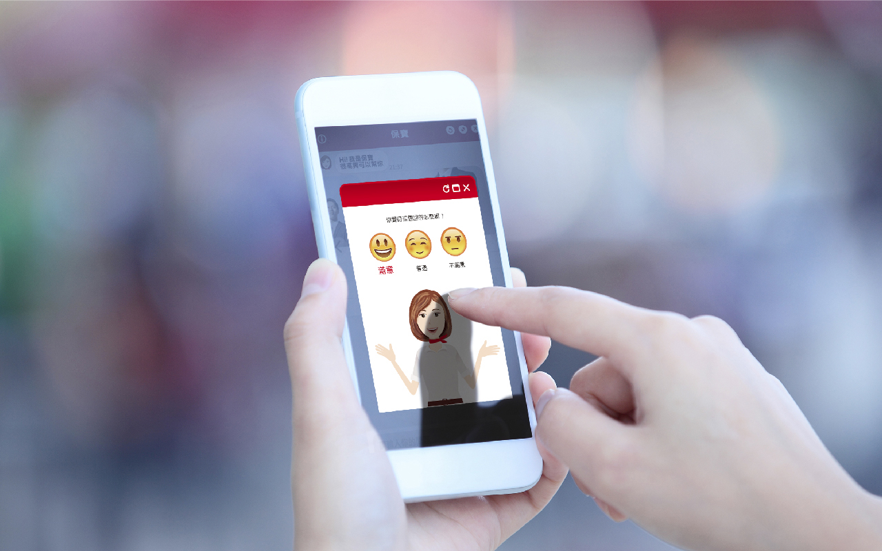 繫著象徵保誠人壽的紅絲巾,同時賦予保寶有別於其它的客服機器人的個性:俐落剪裁的穿著,帶著時尚,親切之外,也有專業的態度。