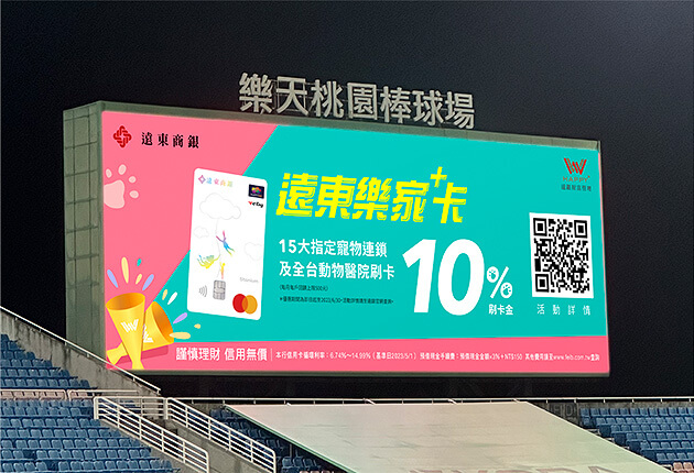 遠東商銀冠名贊助中職樂天球團的愛PET趴,包含現場攤位、球場內電子看板、影片等設計製作。搭配遠東樂家卡的親子、寵物主軸以及球場看板的特色,色彩採用明亮並依調性採用活潑可愛的編排方式