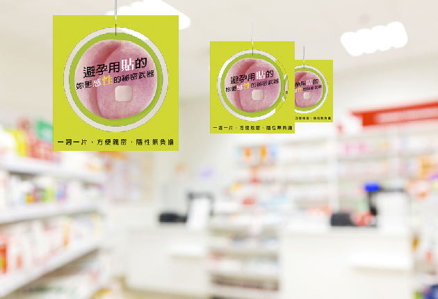 尚未有知名度的避孕貼片,又因相關法律規範無法在大眾媒體曝光,藥妝店就是和消費者接觸的第一現場了。因此從健康、歡愉的角度切入,分為兩大方向:一是以形象健康又性感的女模作為代言人,吸睛之外,也介紹產品的使用方式。二是譬喻,以水蜜桃、香蕉等幽默聯想的造型POP;更設計筆記本作為贈品:100種愛的進行式,在上市初期,引起注目與話題。