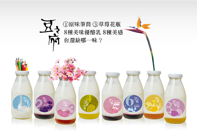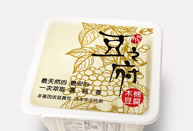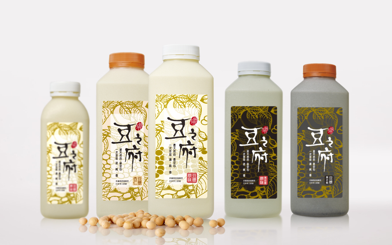 以黃豆的原生植物、以金色調包裝,帶出豆之府天然、一次萃取的特色,給予消費者真正濃純香、非基因改造的純手作豆漿。