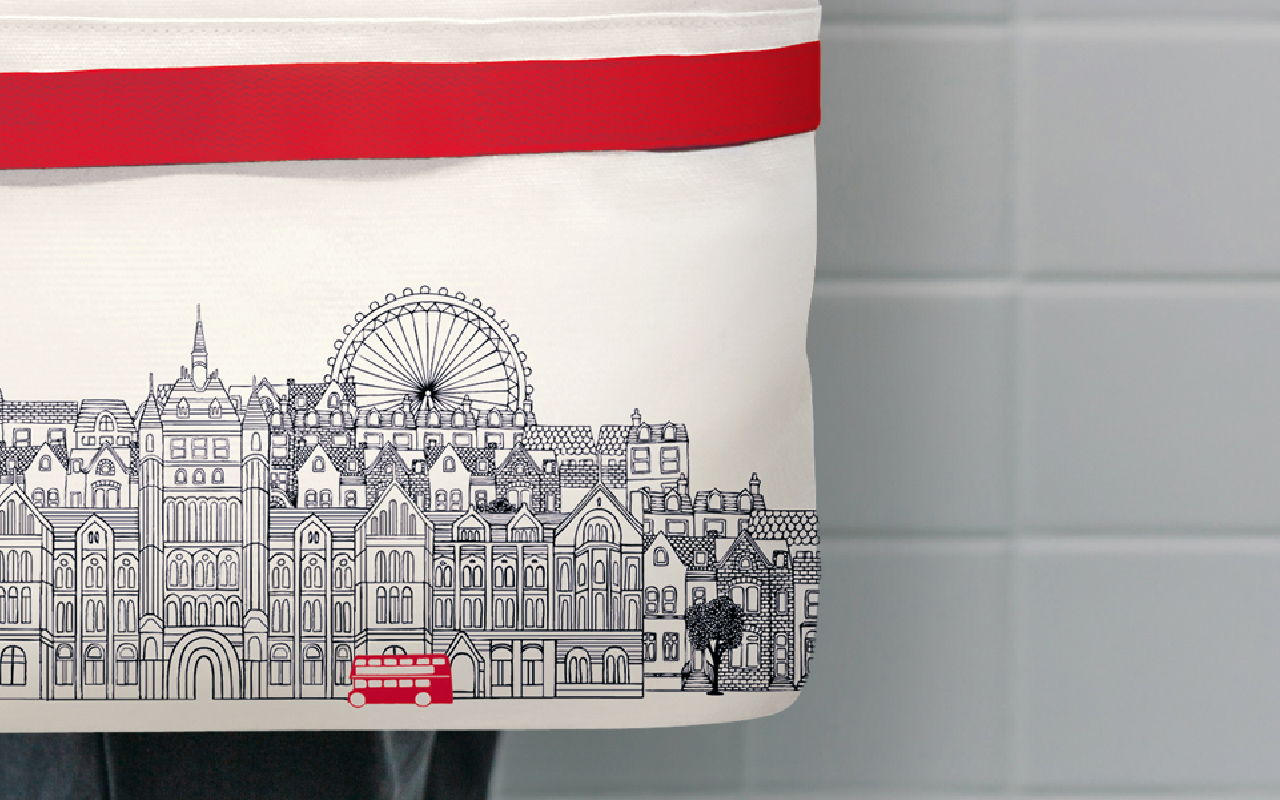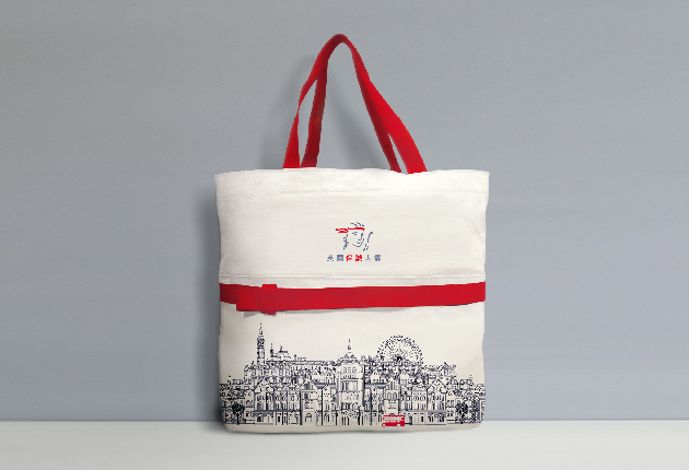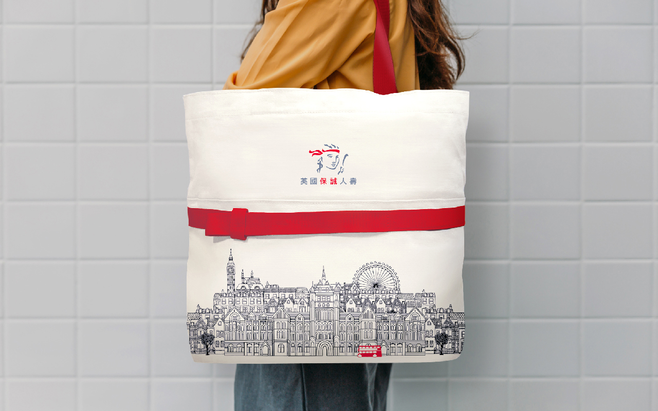 不只是贈品,也想成為樂於攜帶的環保袋。僅使用企業色系的紅、灰惟二色調,並以精細線畫描繪出:保誠人壽的建築與倫敦的市容;細膩的質地與作工,也滿足了時尚的要求。