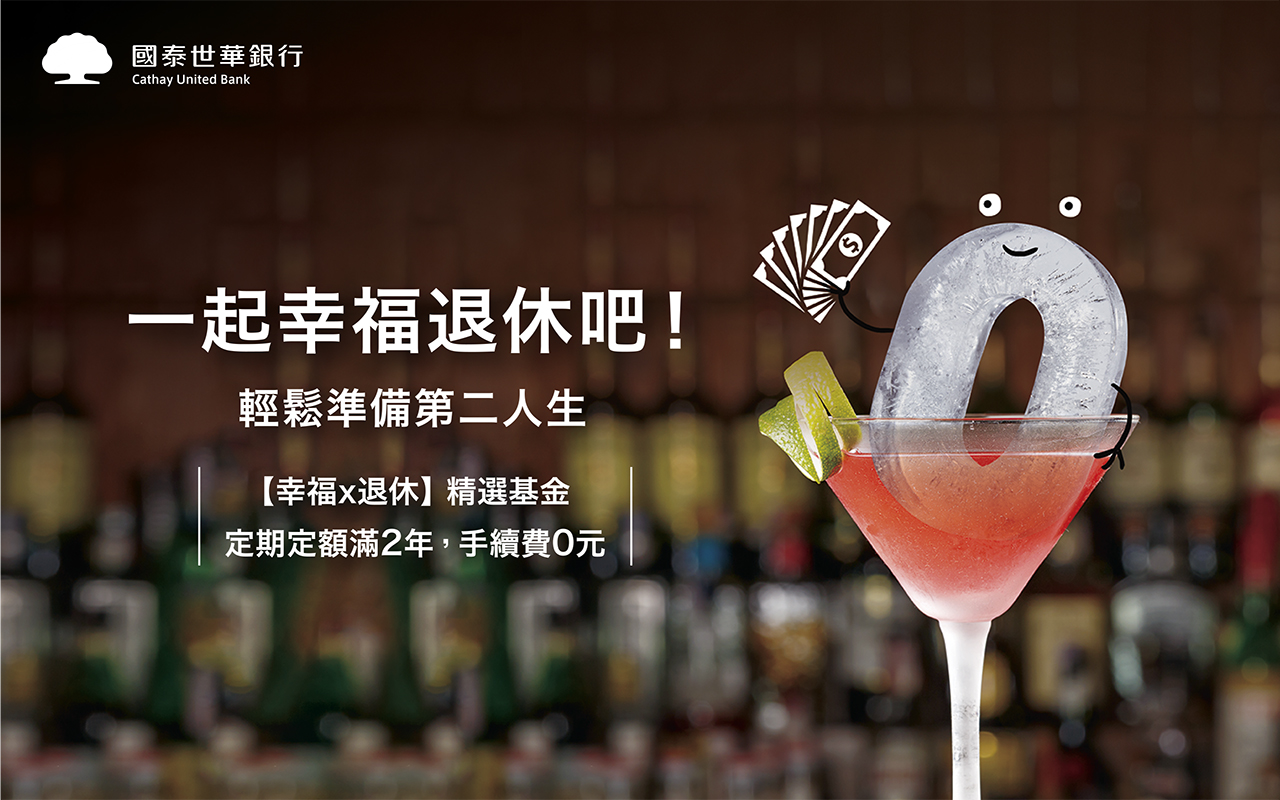 一杯清爽的雞尾酒暗示著退休人生的期望,酒杯中數字零的造型直接點出商品的最大亮點,生動的表情添加視覺的豐富性。