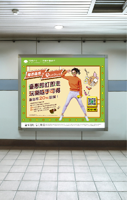 整合國泰集團的食衣住行於此APP,根據不同合作對象以及優惠於每季推出燈箱廣告。透過活潑的人物以及鮮豔的顏色呼應此APP生活、有趣的服務,除此之外主副標也採用額外設計的字體,讓活動的主題更加突顯。